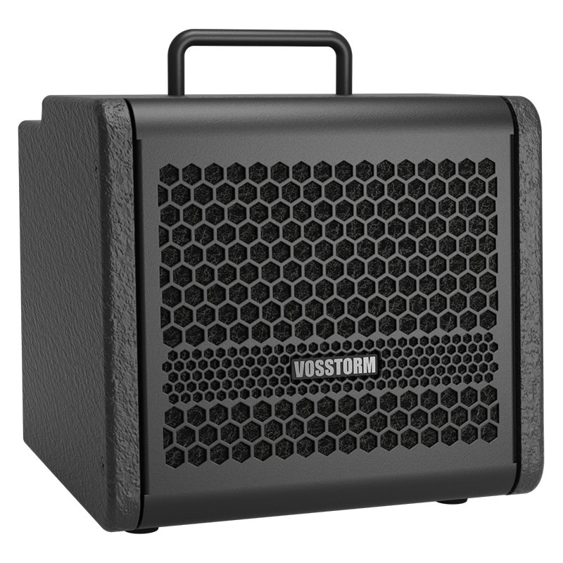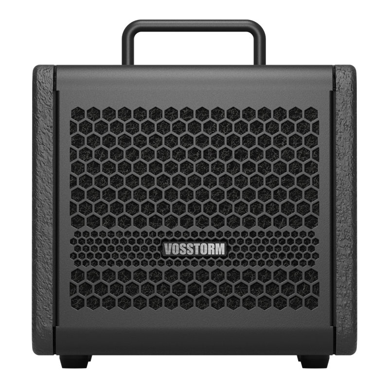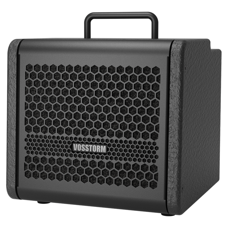 O gabinete acústico bass reflex é construído com MDF e acabamento em poliéster. Na parte frontal, uma tela em aço com furos sextavados e pintura eletrostática texturizada confere beleza e proteção para o alto-falante.